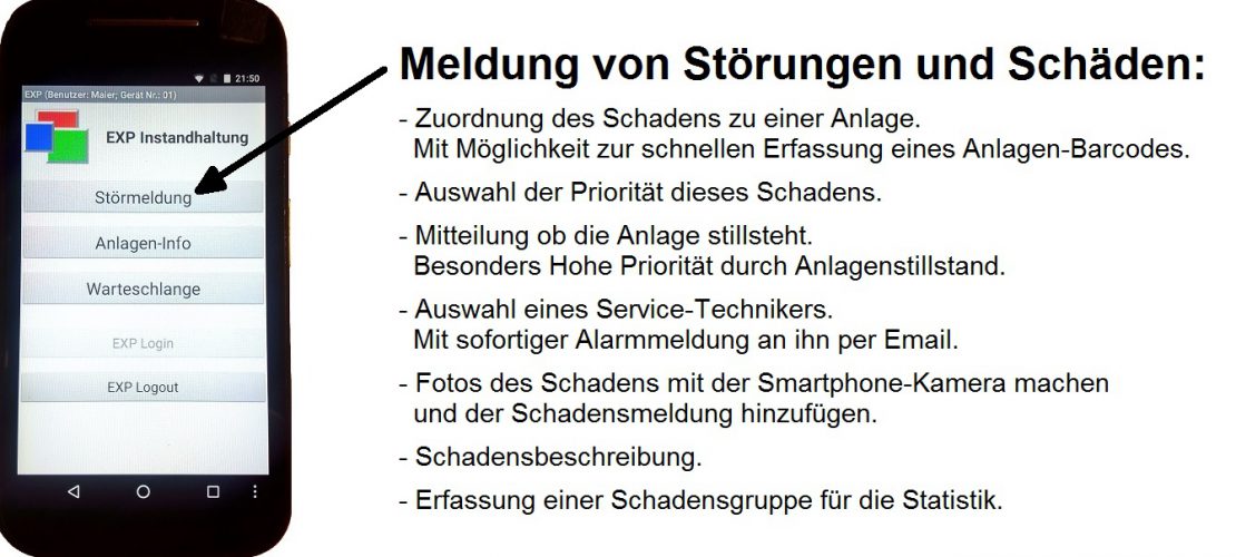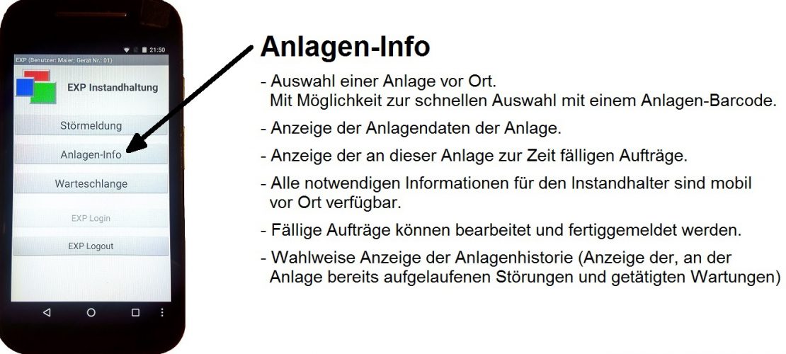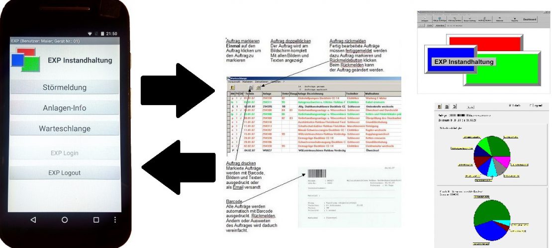 Smartphones und Tablets können ähnlich wie PDA’s oder mobile Barcodescanner in Verbindung mit der Instandhaltungssoftware EXP-Instandhaltung eingesetzt werden.