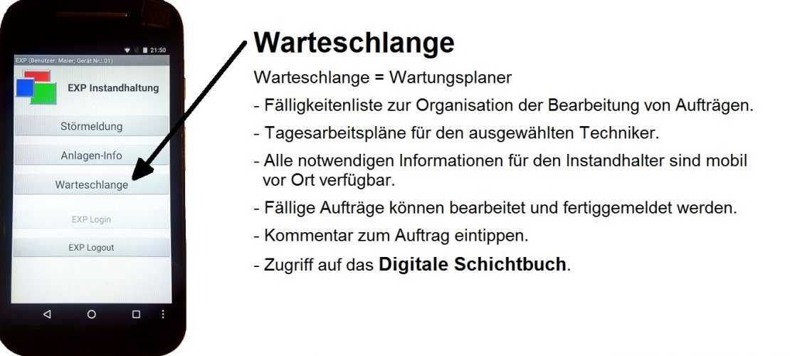 Mit Hilfe dieser Geräte können auch Aufträge bearbeitet und fertiggemeldet werden und es können Störungen erfasst werden. Nach Bearbeitung der Aufträge oder Störungen werden sie als normale Aufträge in das EXP-Instandhaltung übernommen